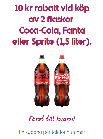 Hämta en mobilkupong som ger 10 kr rabatt vid köp av 2 flaskor Coca-Cola, Fanta eller Sprite (1,5 liter) hos ICA.