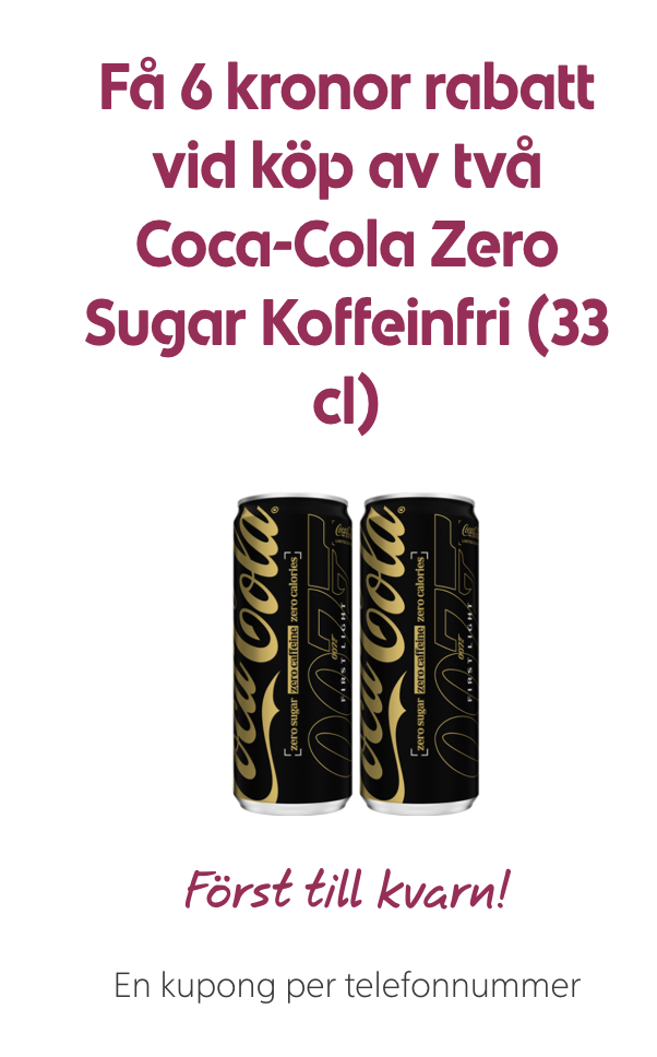 Få en mobilkupong som ger 6 kronor rabatt vid köp av två Coca-Cola Zero Sugar Koffeinfri (33 cl) på ICA.