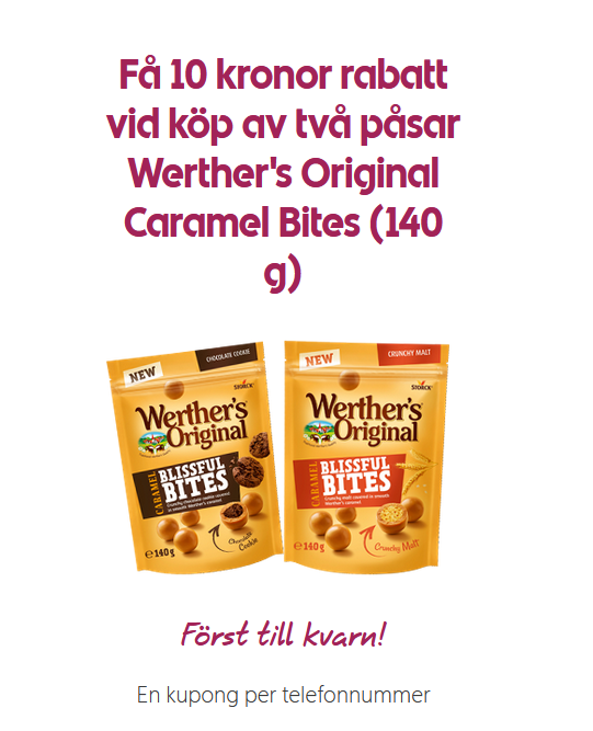 Hämta en mobilkupong som ger 10 kr rabatt vid köp av två påsar Werther’s Original Caramel Blissful Bites Crunchy Malt eller Chocolate Cookie (140 g) på ICA.